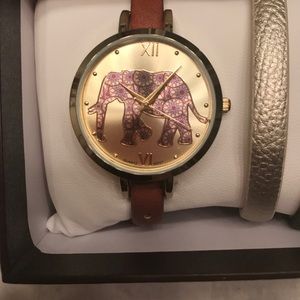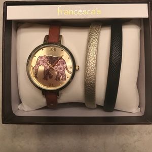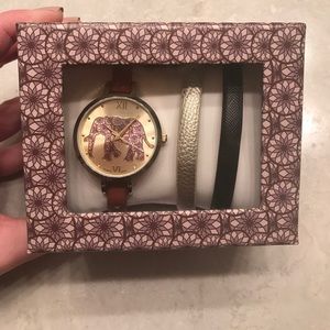 Adjustable watch with multiple bands, never worn, in perfect condition. Comes with a brown, gold, and black band. Batteries and box included.