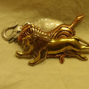 This is a metal pin or brooch has an elephant, zebra, and Lion.