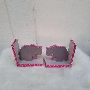 Elephant book ends boho decor pink , white and gray polka dot with beaded accent fabric covered .