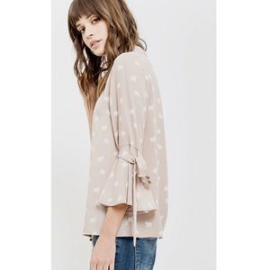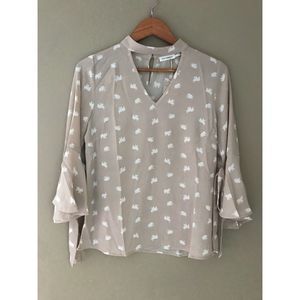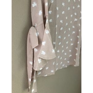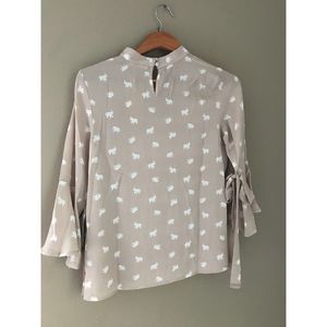Sand color with white elephant print blouse features 3/4 bell sleeves. Ties at the sleeves. Choker with v neckline. Back button closure. Textured Polyester. Young contemporary sizing. Suggest sizing up. NWT boutique