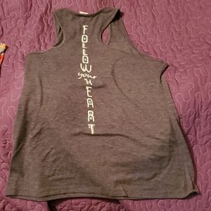 Gray elephant tank top with white design. Says "Life is an adventure" on the front and "Follow your heart" on the back. Some piling on the material but not noticeable.