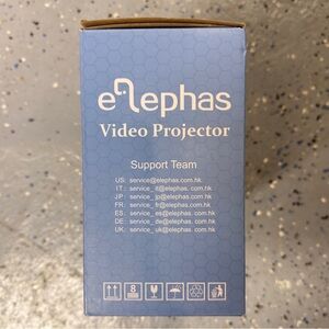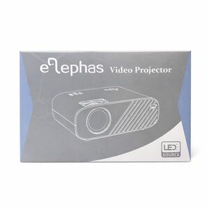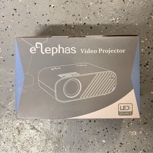 Elephas LED video projector brand new in the box. Compact projector design shown on the box, ideal for home viewing, movies, presentations, or casual entertainment setups.