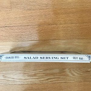 Elesva Amsterdam Holland Salad Serving Set Blue and White Handles. Porcelain like handles with blue and white traditional Dutch motif of a windmill. Same design on each side of the handles. Stainless steel shaft and head. Two pieces. Excellent condition in original box. Appears to have never been used. No scratches on stainless steel.