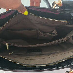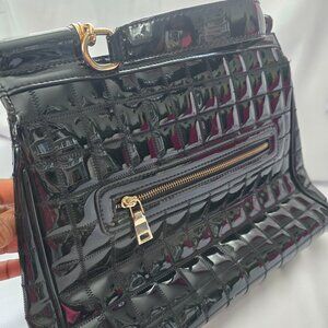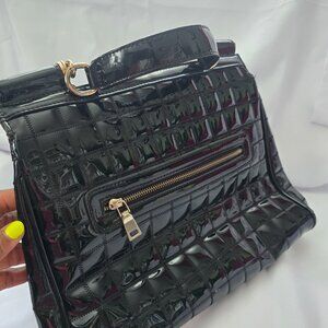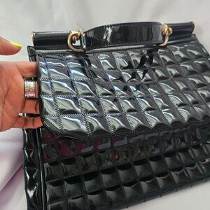 Another stunning english made black patent leather bag with a classic structured silhouette fits laptop and work essentials. Ideal for commuting in style. Solid handles high end quality leather grade condition.