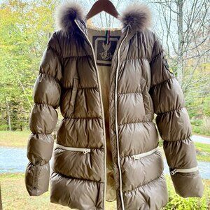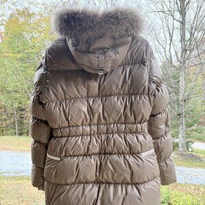 This mid-length down puffer jacket contours the body, while keeping you warm and dry with a water repellent shell, storm cuff sleeves, and a down-filled hood with removable fur trim. Style meets function with 2 fleece-lined zip pockets, a signature sleeve cuff zip pocket, and a mesh chest pocket on the inside.