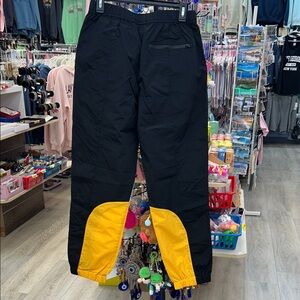 Stylish joggers with a bold color block design. Features black, blue, and yellow panels. Comfortable fit with elastic waistband.
