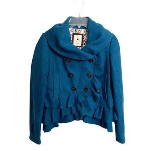 Elevenses Anthropologie Blue Tweed Ruffle Peacoat Jacket SZ 4 Cowl Neck Romantic