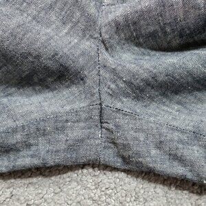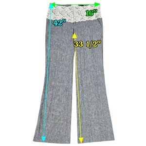 Good used condition, with no stains or tears. Romantic gray flare pants, with ivory lace trim around the waist. Has functional side pockets and a zip fly/hook closure. Seems like a relaxed fit. The gray fabric is speckled.