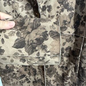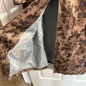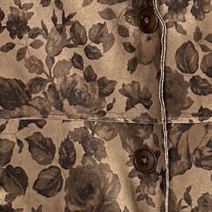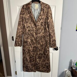 Elevenses by Anthropologie faux suede duster/trench coat in size 6. Elegant floral brown long coat perfect for any occasion. 3 button front, long sleeve, side slash pockets, lined in gray. 19" back slit for ease of movement. 100% polyester.