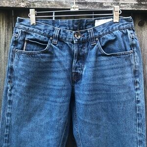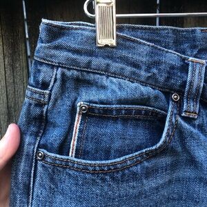 Eleventy 5 Tasche Jeans, made in Italy. Low rise, straight leg, cropped length, raw hems. These may have been DIY cut, I’m not sure. Hidden button fly. 100% cotton. Great used condition. A bit of wear at the top button hole, but it doesn’t impede function at all. Marked size 33, but the waist measures 30”. These are also marked “Young”, so they could be young adult jeans. Listing as size 6.
