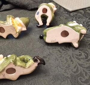 Set of green ceramic elf figurines. Charming decorative pieces for shelves or tabletops. Made in Japan. Very good condition!