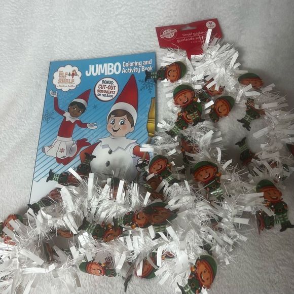 Do you struggle to come up with ideas every night for your elf on the shelf. Start early for next year with this set. The coloring and activity book is actually the Elf On The Shelf brand. The adorable elf tinsel isn't but it is so fun and unique. Both items are new!