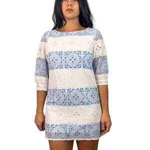 Elf Sack White & Blue Lace Mini Dress. Excellent condition. Lined. 3/4 length sleeves. T33 SIZE MEDIUM Measurements (taken lying flat): 15.5 inch sleeve 17.5 inch underarms 29.5 inch length