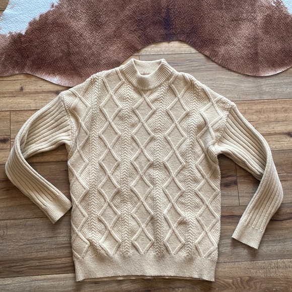 The sweater in the image is an Aelfric Eden cable knit sweater in a cream color. It features a woven diamond pattern and ribbed detailing at the neck, cuffs, and hem. The sweater is described as oversized and unisex, made from soft, high-quality material, likely a cotton blend or acrylic. It is suitable for cooler weather and can be styled with various outfits.