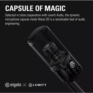 The Elgato Wave DX Dynamic Cardioid Microphone is a high-quality microphone suitable for studio recording, home recording, and broadcasting. It features noise cancellation and a dynamic transducer type, making it perfect for capturing vocals and acoustic instruments. The microphone has a mounting plate and uses an XLR 3 pin for connectivity.