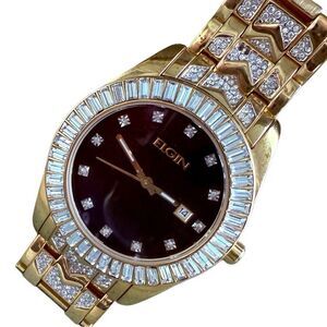 Make a bold statement with this stunning Elgin men’s watch, featuring a polished gold-tone case, richly textured black dial, and a dazzling bezel of baguette-cut crystals. Diamond-like hour markers add elegance, while the band showcases chevron patterns encrusted with sparkling stones for extra flash. This watch is currently not working due to a missing battery but is in excellent cosmetic condition with no missing crystals and minimal wear overall. Model FG1509, water resistant, stainless steel back, Japan movement. A fantastic piece for collectors or anyone who loves standout accessories!