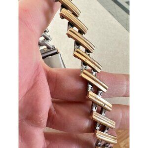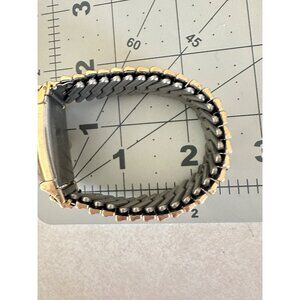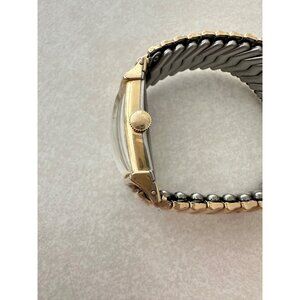 Great condition, shows minor wear/scratching to gold fill in a few places. Winds up and keeps time perfectly, including small seconds hand. White dial features handsome gold numerical and stick hour markers. The Shockmaster was intended to be an endurance piece, made to withstand shock, bumps, and jolts, an endeavor in which Elgin succeeded as evidenced by this specimen still functioning as intended, making this model highly prized and coveted by Elgin collectors everywhere. Case is 10kt rolled yellow gold and is paired with a 12kt yellow gold filled Hadley expansion bracelet which stretches all the way up to 10" and sits comfortably on any wrist. Case measures 28mm x 23mm. Please see photos for additional measurements in inches.