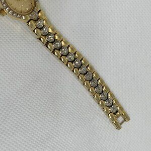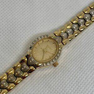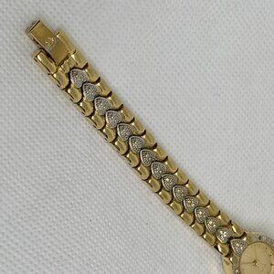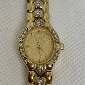 Elgin classic gold silver watch quartz analog 17mm oval case ELA72BN hearts shaped links bracelet size 7”, in good used condition missing one bezel rhinestone, works good battery installed