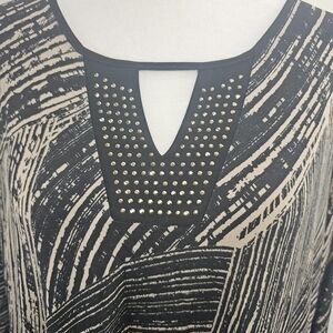 Elie McCarthy 2X half sleeve blouse. shark bite hem. gold embellishments on front.