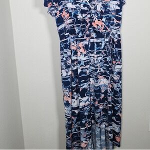 Keywords: Elie Mclarty, maxi dress, wrap dress, floral dress, hi low dress, plus size dress, women's dress, summer dress, resort wear, blue coral dress, 1X dress, bohemian dress, casual dress, vacation dress, tropical dress