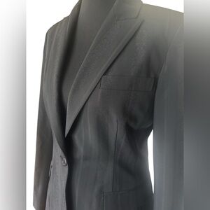 This Elie Tahari suit jacket in classic black offers a tailored fit with traditional notched lapels, making it ideal for professional settings. Its clean lines and sophisticated design ensure a polished appearance for any formal occasion. Please see pics for pretty and subtle detail design of fabric. Classy!!