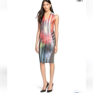 Elie Tahari Isabella dress. The Neoprene style. Abstract striped with ponte knit side panels. V neck. Sleeveless. Sheath style. Knee length. Back zipper. Back slit.