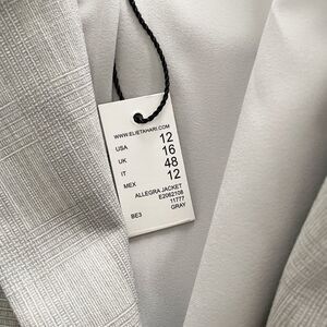 Brand new Allegra jacket from Elie Tahari. Micro plaid grey color. One button front, diagonal pockets.Approx 27” long and 19” armpit to armpit when buttoned.