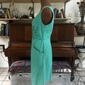 Step into effortless sophistication with this Elie Tahari sheath dress in a vivid aqua blue. With its ruched waist detailing, flattering V-neckline, and tailored silhouette, this dress is both striking and versatile—perfect for work events, summer weddings, or any occasion where chic style is required.