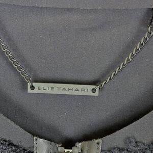 The Elie Tahari Black Mesh Front & Trim Zip Front Blazer is a stylish and edgy motorcycle jacket designed for women. Made of cotton with a mesh pattern, this short jacket features a zip closure and long sleeves, perfect for the punk and grunge aesthetic. The black color and open front add to the versatility and appeal of this piece, making it a unique addition to any wardrobe. Ideal for those who appreciate a blend of classic and contemporary styles with a touch of rock and gothic influences.