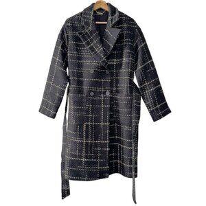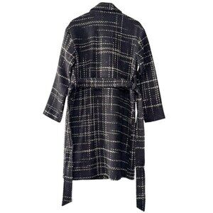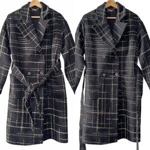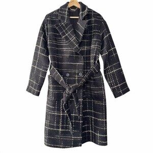 Elie Tahari Women Black Plaid Tweed Wool Double Breasted Wrap Trench Coat