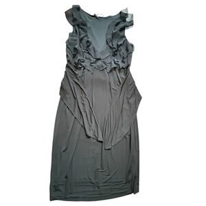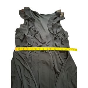 Elegant and timeless, this Elie Tahari black dress features stunning ruffle detailing across the bodice, adding texture and dimension to the flutter sleeves and deep V neckline. The waist is cinched with wide, attached sash ties that can tie to create a flattering silhouette above the flowy A-line skirt. Dress is fully lined for comfort and coverage. No size tag — please refer to measurements for best fit: