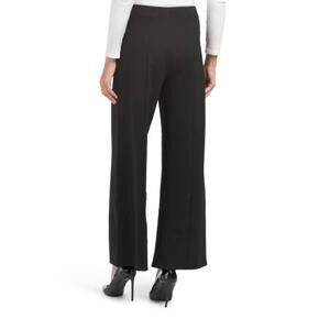 The product is a pair of Elie Tahari Black Wide Leg Pants in size 6. These pants feature a gold buckle accent, a wide-leg style, and a mid-rise waist. Made from a blend of rayon, nylon and spandex jersey fabric, they offer a comfortable and stretchy fit. Suitable for casual, formal, or business occasions, these pants have a flat front and a 27-inch inseam. Perfect for all seasons, they add a touch of elegance and style to any outfit.