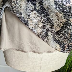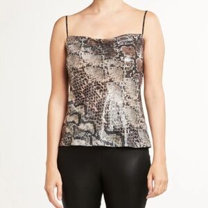 'Jerri Blouse' Draped neckline. Adjustable spaghetti straps. All-over snake print. All-over sequins. Lined. Pullover style.
