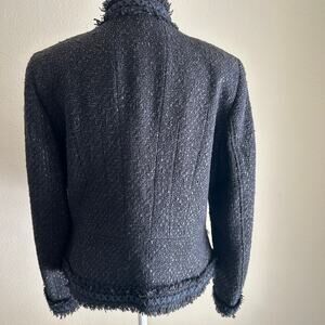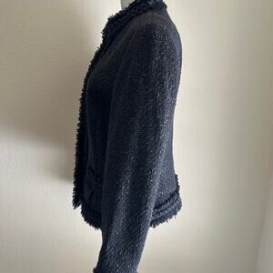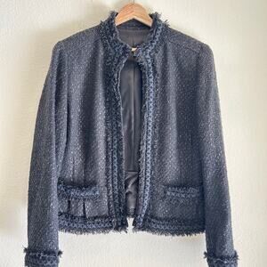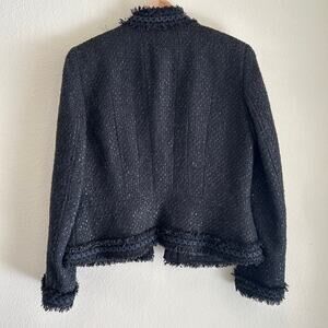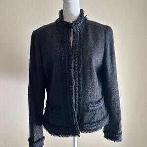 Elie Tahari Boucle Tweed Jacket Lined Front Pockets Black Fringe Hem