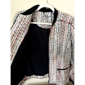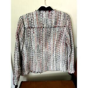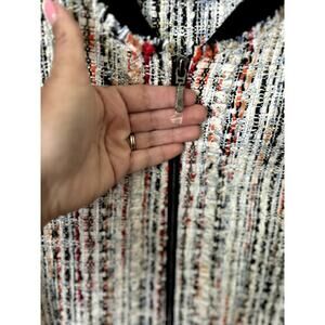 This beautiful jacket has never been worn, as seen by the plastic still on zipper handles (see pics). Colorful tweed bomber style jacket has a crew neck, and zips up the front.