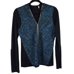 Elie Tahari Cardigan Sweater Zipper Black Blue Tweed Boucle Wool Blend S