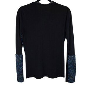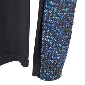 Great sweater from Elie Tahari. Sweater has a unique zipper that goes all the way around the neck allowing you to zip as high or as low as you'd like! Lightweight black wool back and sleeves accented with front panels made of a boucle tweed textured material in shades of blue and a subtle metallic thread.