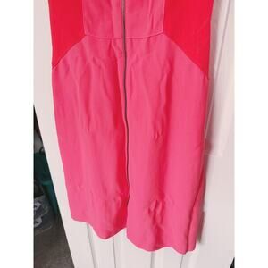 Make a sophisticated statement in this Elie Tahari sleeveless mini dress, featuring a striking pink and red colorblock design with a flattering zip-up front. The tailored silhouette and bold palette blend modern edge with romantic flair—perfect for date nights, events, or standout office style.