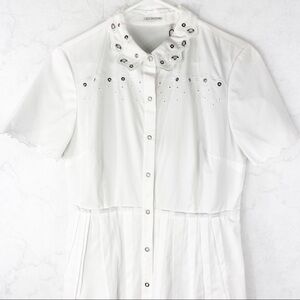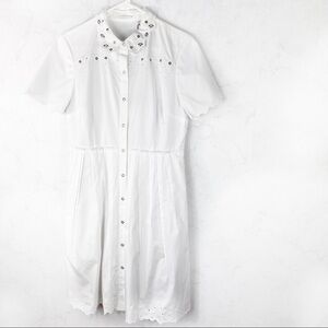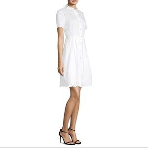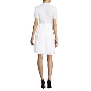 Elie Tahari Samiyah Fit & Flare Shirt Dress. Spread Collar. Short Sleeves. Snap Button Down Front Closure. Banded Waist. Eyelet Hem. Silk Organza Scalloped Trim. Cotton Lining. Flirty Ruffle Sleeve & Hem Scalloped Details. Eyelet Details. Pleated Flare Silhouette. Super Cute & Comfy. NWT / New With Tags. No Stains or Rips.