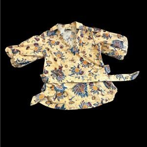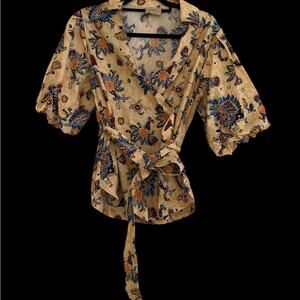 Elegant wrap blouse with floral print. Features a tie waist and short sleeves. Perfect for any occasion.
