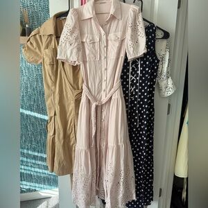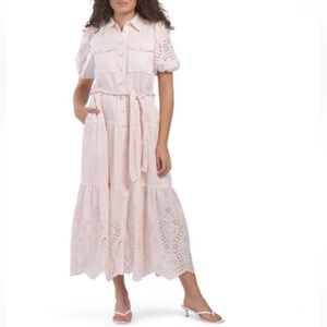Chic light pink maxi dress with eyelet details. Features a stylish belt and puff sleeves. Perfect for a feminine look. This is the high end line of Tahari. It’s very well made and only worn a couple of times. The elastic on the sleeves I cut off because I didn’t like the puff shoulder look so now it’s more relaxed