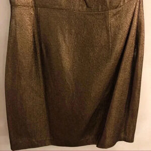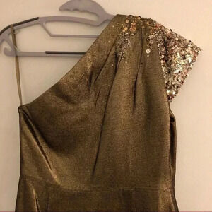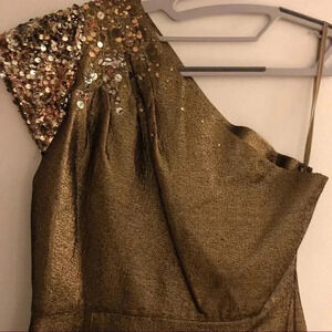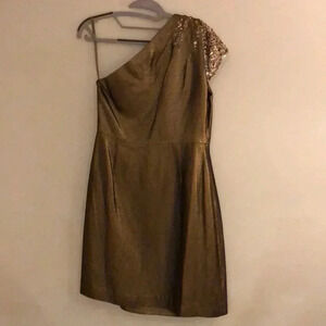 Only worn once. Cocktail dress by Elie Tahari. One shoulder, cap sleeve with sequin details in a beautiful antique gold color. Size 6.