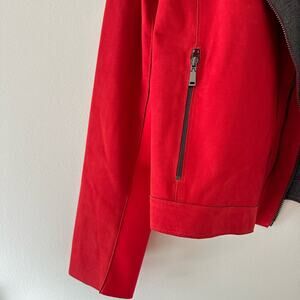Details: Elie Tahari Lamb Suede Asymmetrical Zip Moto Jacket - Size: L- Color: Red- Material: 100% Lamb Suede- Features: Zipper closure, round neck, lined, professional leather clean, zip pockets, comfort, breathable, casual. Style: EN3JJ105