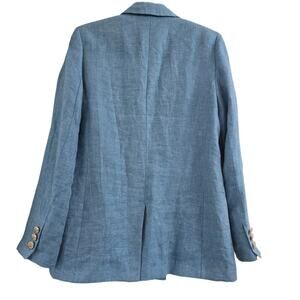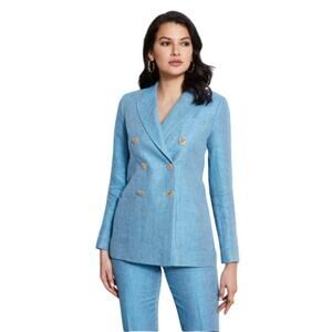 Elie Tahari women’s blazer in a beautiful blue linen. This double-breasted jacket features classic gold-tone buttons, notched lapels, and a tailored silhouette—perfect for both professional and casual looks. The lightweight linen fabric offers breathability and comfort, making it ideal for spring and summer