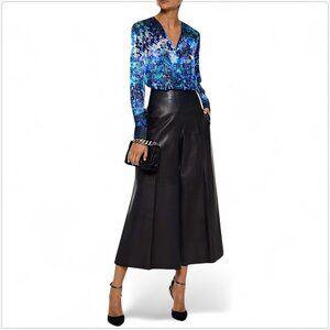 Elie Tahari Lydia Leather Trimmed Floral Snap Front Silk Blue Top Blouse XS