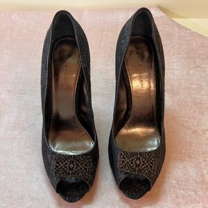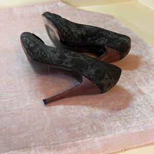 Gently worn Elie Tahari peep-toe heels with dark green jacquard fabric and 4 inch chocolate chagreened leather covered heels. With original box and shoe bag.
