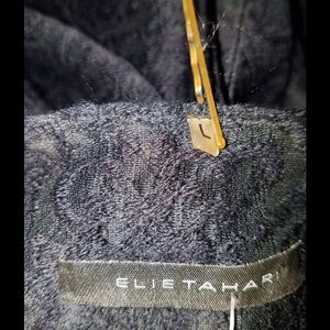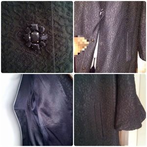 Stunning Elie Tahari dress coat. Navy jacquard fabric, and beautiful covered buttons. 3/4 length ruffle sleeves and snap front closure. Wonderful piece for those holiday parties! 90% virgin wool, 10% silk.