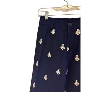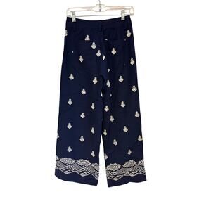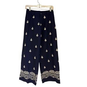 Elie Tahari Navy Blue & White Embroidered Linen Blend Wide-Leg Pants NWT