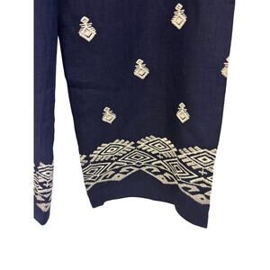 Elie Tahari Navy Blue & White Embroidered Linen Blend Wide-Leg Pants
