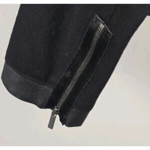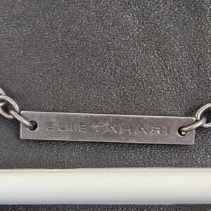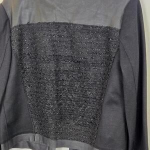 The Elie Tahari Open Front Wool Lamb Leather Jacket in size Medium features a sleek design with a silver shimmer that adds a touch of luxury to the classic black color. Made with high-quality leather and lined with warm wool, this short jacket is perfect for adding a stylish accent to any outfit. The long sleeves and open front make it easy to throw on for a casual look with a hint of sophistication. Perfect for those who appreciate motorcycle and bohemian themes, this jacket is a versatile piece that can be dressed up or down for any occasion.